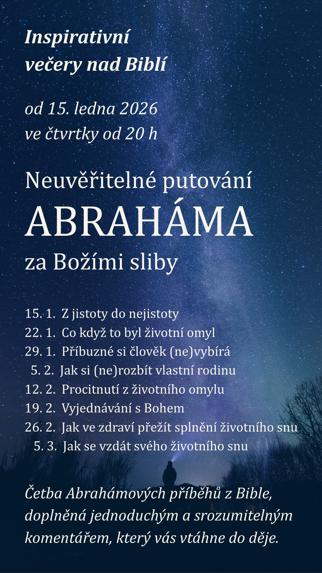Četba Abrahamových příběhů z Bible, doplněná srozumitelným komentářem a společným zamyšlením nad tím, co tyto příběhy říkají o našem životě dnes. Na závěr je prostor pro otázky a společný rozhovor.